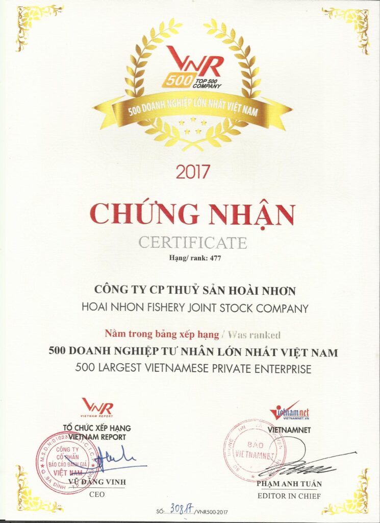 Từ năm 2008 đến nay Cty CP thủy Sản Hoài Nhơn luôn đạt top vnr500 Top 500 doanh nghiệp tư nhân lớn nhất Việt Nam