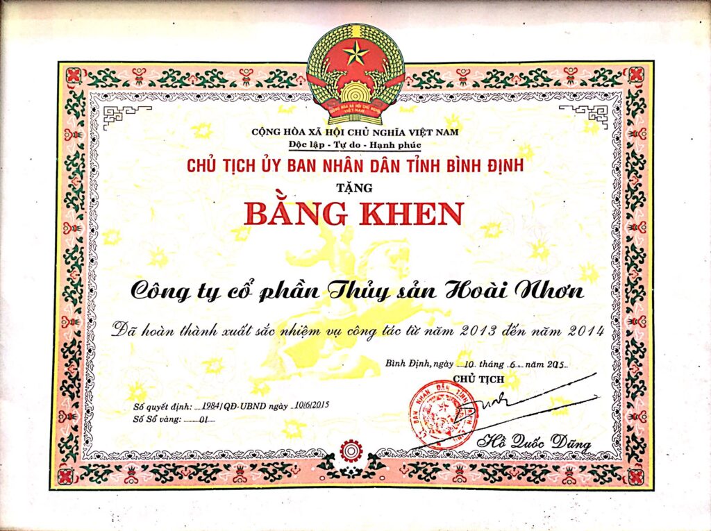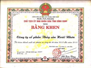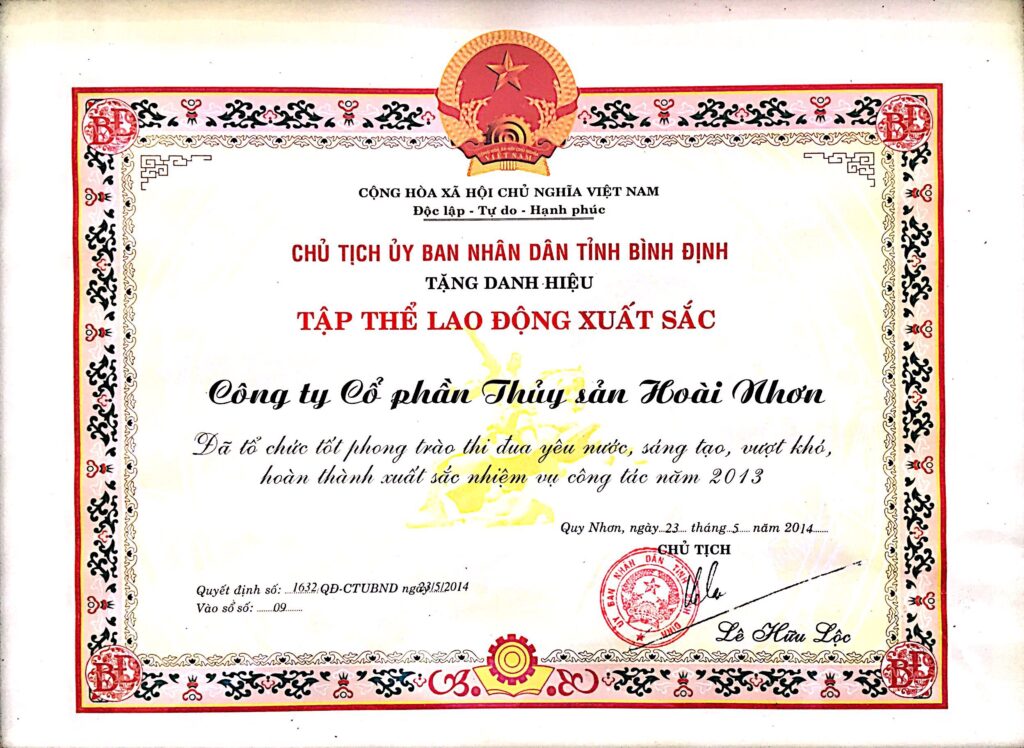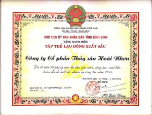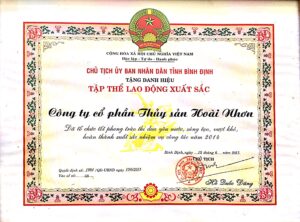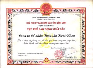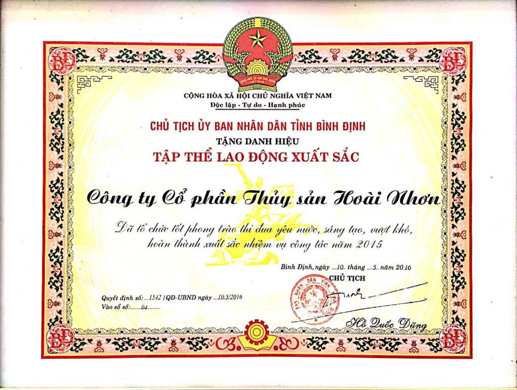 Ngày 10/05/2016 Ủy ban nhân dân tỉnh đã phong tặng danh hiệu tập thể lao động xuất sắc cho công ty CP thủy sản Hoài Nhơn.